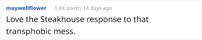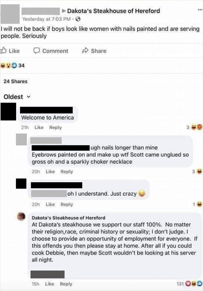 Une capture d’écran d’une critique Facebook d’un Steakhouse à Hereford, au Texas, est devenue virale sur Reddit avec 26 000 votes positifs dans le subreddit appelé r/insanepeoplefacebook avec le titre « Debbie refuse d’être servi par des serveurs trans ; mari vient même décollé à la pensée! Le restaurant s’en moque.
