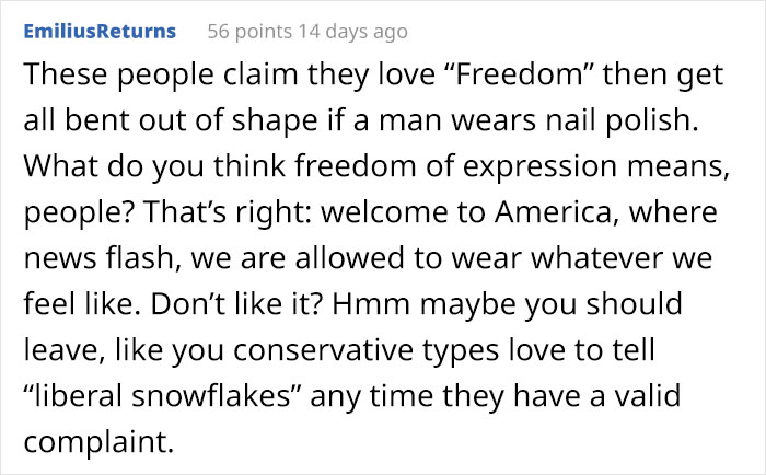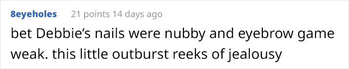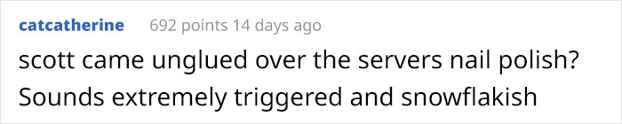 Lorsqu’une autre personne qui partageait sa douleur a répondu au client insatisfait, Debbie a répondu avec un peu plus d’informations. Elle a dit que le serveur avait des ongles plus longs que les siens, était maquillé et avait des sourcils peints. La goutte d’eau pour Debbie était que le serveur portait un collier ras de cou étincelant.