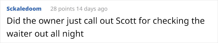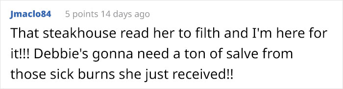 Ce qui a rendu Internet fou, c’est que le propriétaire ne s’est pas arrêté là. Il a poursuivi: «Si cela vous offense, alors s’il vous plaît, restez à la maison. Après tout, si vous pouviez cuisiner, Debbie, alors peut-être que Scott ne regarderait pas son serveur toute la nuit.
